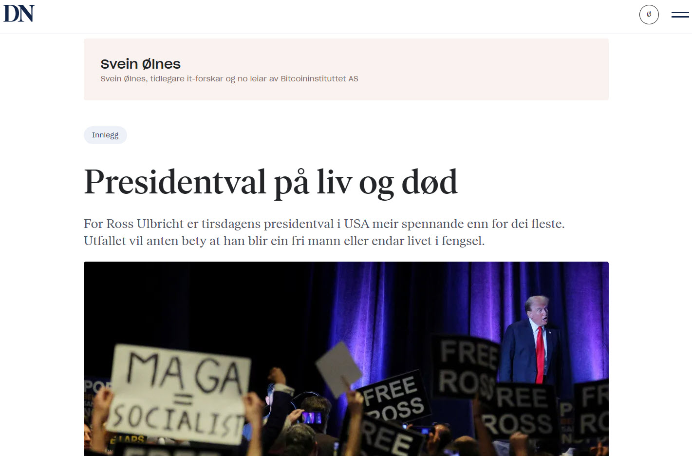 Dette lesarinnlegget vart publisert i Dagens Næringsliv 1. november i år. No veit me at Trump vann presidentvalet og at Ross Ulbricht etter all sannsynlegheit vil bli ein fri mann etter 20. januar 2025, om Trump held det han lova. Me har lært at Trump ikkje er å stola på, men akkurat denne lovnaden trur eg han er nøydd til å innfri.